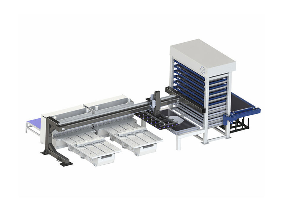 鈑金智能儲料庫用于分類儲存各類金屬板材,通過電腦控制板材的進出、選取各層板材,與企業的MES系統相連接,為